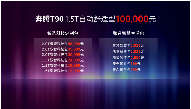 奔騰T90采用了全新的定價模式,打破了車企傳統(tǒng)的款型定價模式。除了有起售價之外,用戶還可以選擇不同的配置升級包,根據(jù)自己的個人需求和預(yù)算進(jìn)行選擇和增配,實(shí)現(xiàn)個性化定制。此舉使得消費(fèi)者可以根據(jù)自己的實(shí)際需求定制奔騰T90,為他們提供更具性價比的選擇。