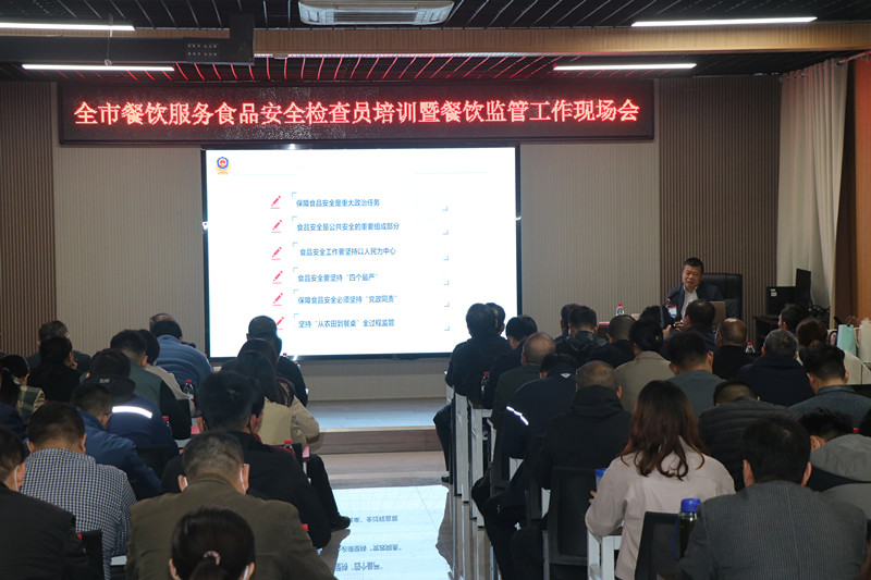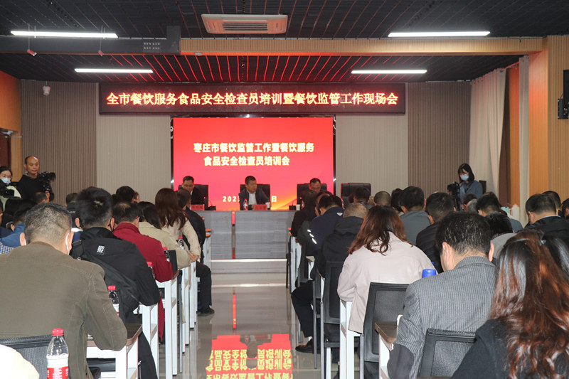 為進(jìn)一步豐富餐飲服務(wù)食品安全檢查員業(yè)務(wù)知識(shí),提升全市餐飲環(huán)節(jié)食品安全監(jiān)管水平,棗莊市市場(chǎng)監(jiān)督管理局根據(jù)2023年餐飲監(jiān)管工作計(jì)劃,于11月8日,在臺(tái)兒莊古城學(xué)校召開全市餐飲監(jiān)管工作暨餐飲服務(wù)食品安全檢查員培訓(xùn)會(huì)議,市、區(qū)兩級(jí)局分管局長(zhǎng)、餐飲科全體人員、全市餐飲服務(wù)食品安全檢查員參加。會(huì)議由市市場(chǎng)監(jiān)管局副局長(zhǎng)張衍耀主持;臺(tái)兒莊區(qū)委常委、副區(qū)長(zhǎng)孫作偉致辭,并介紹建設(shè)“食安臺(tái)兒莊”的經(jīng)驗(yàn)和做法;山東省市場(chǎng)監(jiān)管局餐飲處一級(jí)調(diào)研員遲玉聚博士,作《深刻學(xué)習(xí)領(lǐng)會(huì)習(xí)近平總書記重要論述精神努力守住食品安全底線》主題報(bào)告。