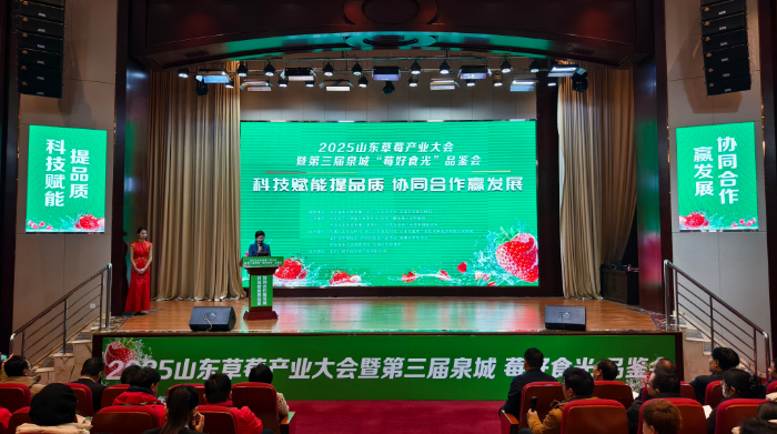 2025年1月10日至11日,由山東農(nóng)學(xué)會草莓專業(yè)委員會、山東廣播電視臺農(nóng)科頻道、濟南市農(nóng)業(yè)技術(shù)推廣服務(wù)中心共同主辦的2025年山東草莓產(chǎn)業(yè)大會暨第三屆中國•泉城“莓好食光”品鑒會在濟南召開。本次大會以“科技賦能提品質(zhì) 協(xié)同合作贏發(fā)展”為主題,旨在搭建草莓生產(chǎn)全產(chǎn)業(yè)鏈的交流與交易平臺,探討草莓產(chǎn)業(yè)前沿品種、技術(shù)及市場發(fā)展趨勢。山東省農(nóng)業(yè)農(nóng)村廳黨組成員、副廳長楊武杰、濟南市農(nóng)業(yè)農(nóng)村局黨組書記、局長孟帥、山東農(nóng)學(xué)會秘書長張希軍等出席了會議。來自全國各地的草莓專業(yè)合作社、種植基地、采購企業(yè)、農(nóng)資及設(shè)施企業(yè)負責(zé)人等300余人參加了此次盛會。