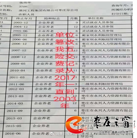 張偉華提供的2003年-2016年保險(xiǎn)記錄中可以看出,保險(xiǎn)經(jīng)歷從藺家壩水利樞紐管理局到棗莊市永興人力資源有限公司,再到淮河工程集團(tuán)有限公司棗莊分公司。