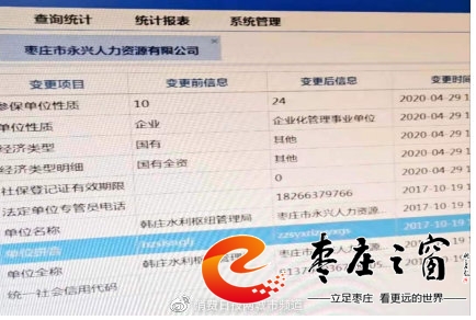 2017年10月17日張偉華的社保由國(guó)有全資韓莊水利樞紐管理局變更為棗莊市永興人力資源有限公司。讓張偉華不能理解的是自己怎么從國(guó)有全資的國(guó)有公司變更到民營(yíng)公司。