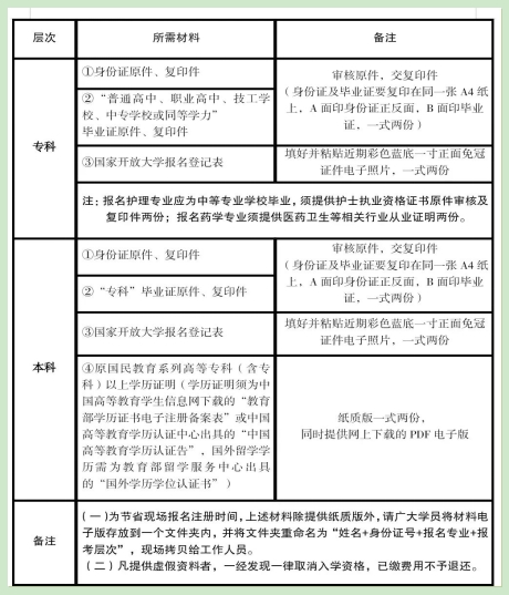 【查驗證件】——【填寫國家開放大學(xué)報名登記表(也可提前自行下載打印電子版填好)】——【在“國家開放大學(xué)統(tǒng)一身份認證平臺”錄入報名信息】——【打印報名信息表后本人核對簽字確認】——【掃碼采集新生照片】——【在線繳費(具體學(xué)費以山東開放大學(xué)開放教育在線繳費平臺為準,屆時如繳費系統(tǒng)不開放,繳費事宜則另行通知)】——【掃碼加入新生微信群】